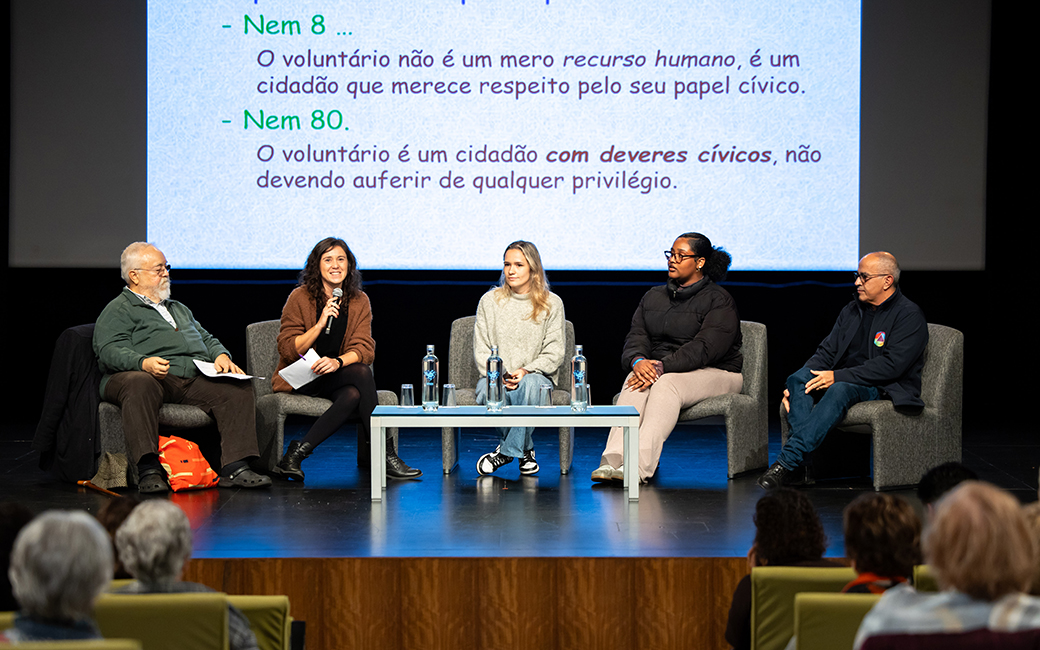 A sessão seguiu com uma mesa-redonda, com a partilha da experiência de voluntariado em diferentes ciclos de vida: Valquíria Costa | Voluntariado Jovem – Projeto Valoriza da Escola Secundária Fernando Namora, Beatriz Jesus | Voluntariado em idade ativa – AMIAMA - Associação dos Amigos dos Animais e do Ambiente da Amadora, Rui Reis | Voluntariado sénior - Academia Sénior da Proteção Civil, e o professor jubilado Hermano Carmo” (ISCSP - Instituto Superior de Ciências Sociais e Políticas da Universidade de Lisboa).