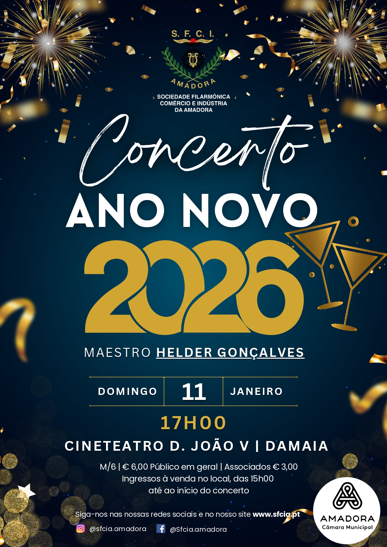 A Banda de Música da SFCIA - Sociedade Filarmónica Comércio e Indústria da Amadora promove, com o apoio da Câmara Municipal da Amadora, o já habitual Concerto de Ano Novo, no próximo dia 11 de janeiro (domingo), pelas 17h00, no Cineteatro D. João V.