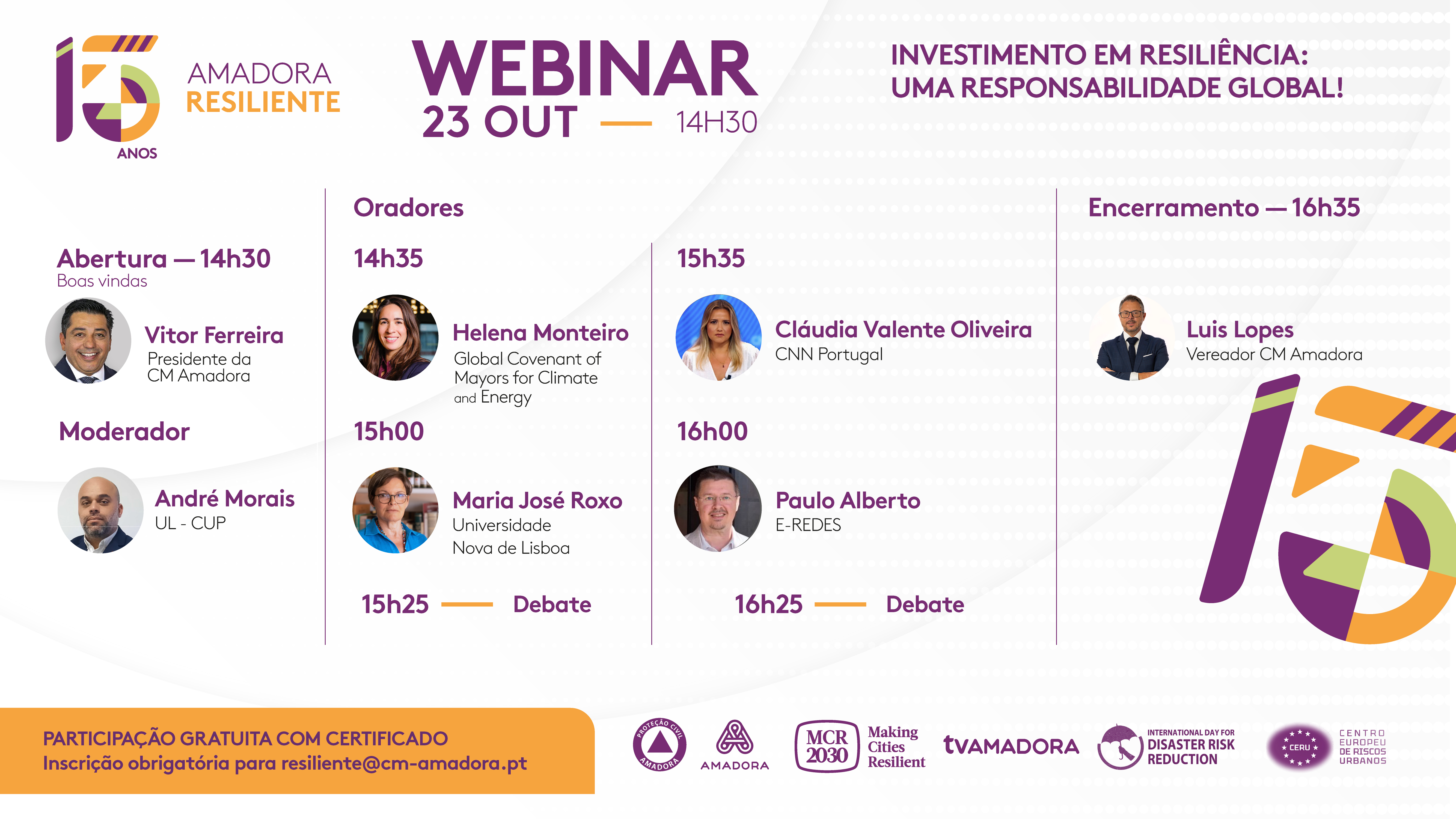 No próximo dia 23 de outubro, a partir das 14h30, realiza-se um webinar subordinado ao tema “Investimento em resiliência: uma responsabilidade global!”, que abordará as problemáticas relacionadas com a comunicação do risco, infraestruturas críticas, clima e energia.
