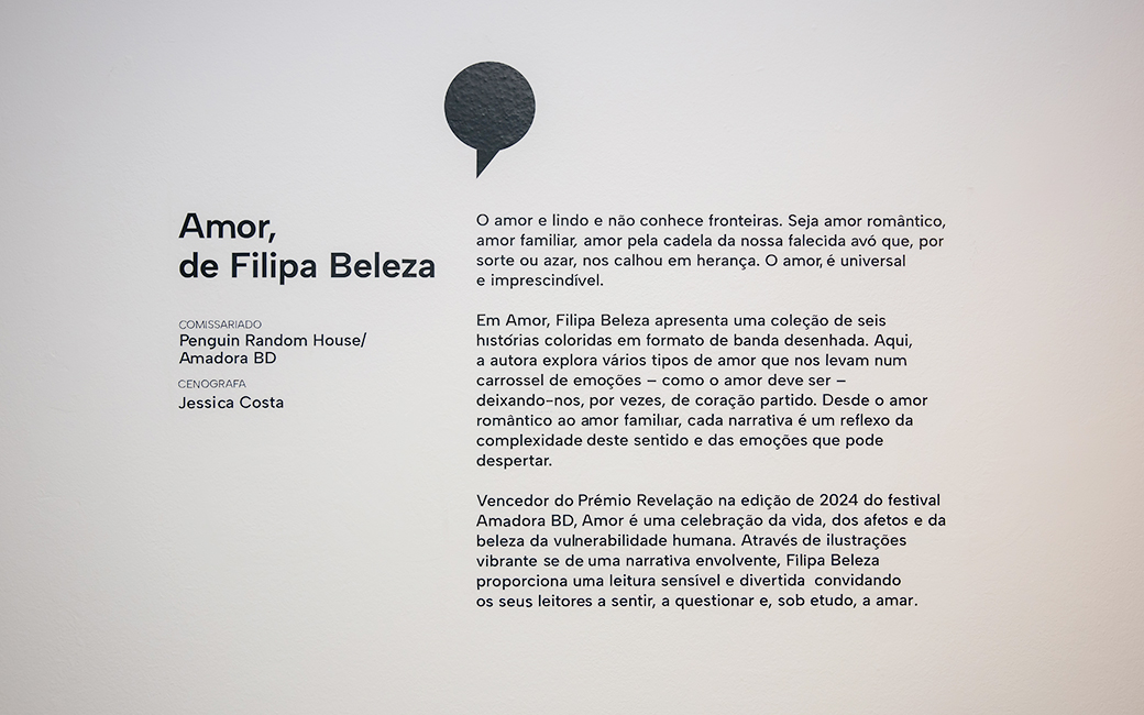 Está patente, até 25 de janeiro de 2026, na Bedeteca da Amadora, localizada no piso 2 da Biblioteca Municipal Fernando Piteira Santos, a exposição "Amor", de Filipa Beleza, uma mostra dedicada ao álbum vencedor do Prémio Revelação na edição de 2024 dos Prémios de Banda Desenhada da Amadora.