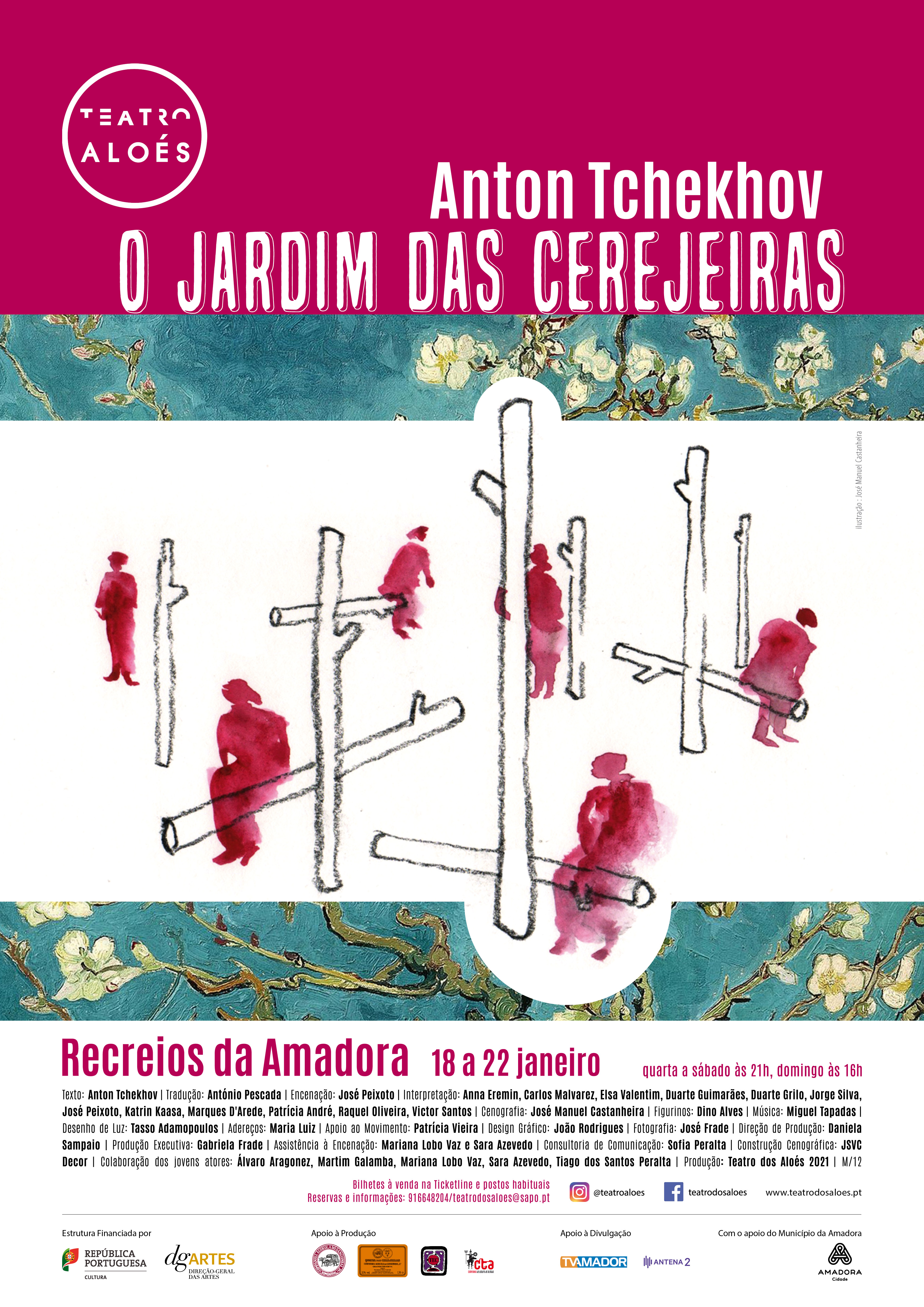 Texto: Anton Tchekhov | Tradução: António Pescada | Encenação: José Peixoto | Interpretação: Anna Eremin, Carlos Malvarez, Elsa Valentim, Duarte Guimarães, Duarte Grilo, Jorge Silva, José Peixoto, Katrin Kaasa, Marques D'Arede, Patrícia André, Raquel Oliveira, Victor Santos | Cenografia: José Manuel Castanheira | Figurinos: Dino Alves | Música: Miguel Tapadas | Desenho de Luz: Tasso Adamopoulos | Adereços: Maria Luiz | Apoio ao Movimento: Patrícia Vieira | Design Gráfico: João Rodrigues | Fotografia: José Frade | Direção de Produção: Daniela Sampaio| Produção Executiva: Gabriela Frade | Assistência à Encenação : Mariana Lobo Vaz e Sara Azevedo | Consultoria de Comunicação: Sofia Peralta | Construção Cenográfica: JSVC Decor | Colaboração dos jovens atores: Álvaro Aragonez, Martim Galamba, Mariana Lobo Vaz, Sara Azevedo, Tiago dos Santos Peralta | Produção: Teatro dos Aloés 2021| M/12
