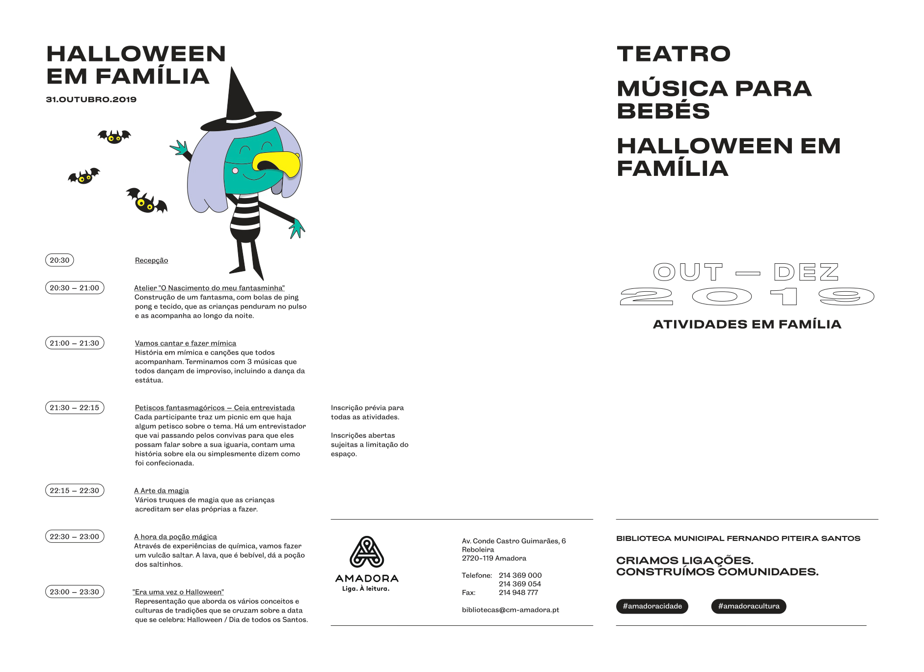 Na noite de 31 de outubro, entre as 20h30 e as 23h30, as famílias com crianças até aos 12 anos poderão vestir-se a rigor e participar em várias atividades, como o atelier “O nascimento do meu fantasminha”, “Vamos cantar e fazer mímica”, “Petiscos fantasmagóricos”, “A arte da magia”, “A hora da poção mágica” e “Era uma vez o Halloween”.
