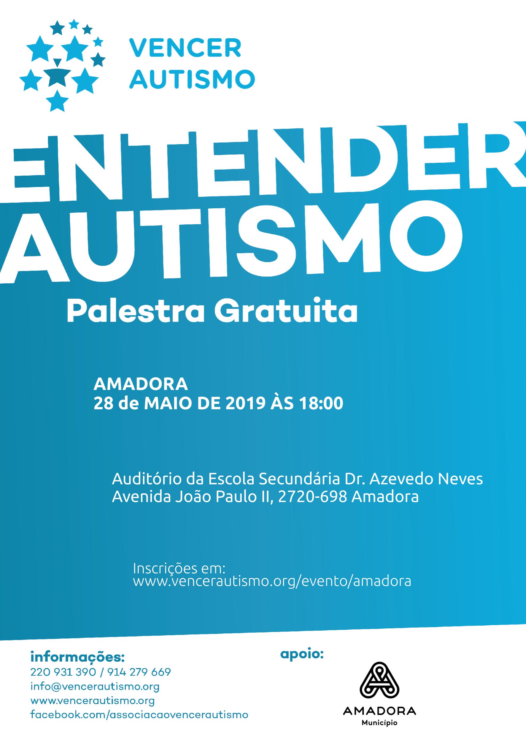 No próximo dia 28 de maio, pelas 18h00, realiza-se no Auditório da Escola Básica e Secundária Dr. Azevedo Neves uma Palestra intitulada “Entender Autismo”, promovida pela Associação Vencer Autismo, em colaboração com a Câmara Municipal da Amadora.